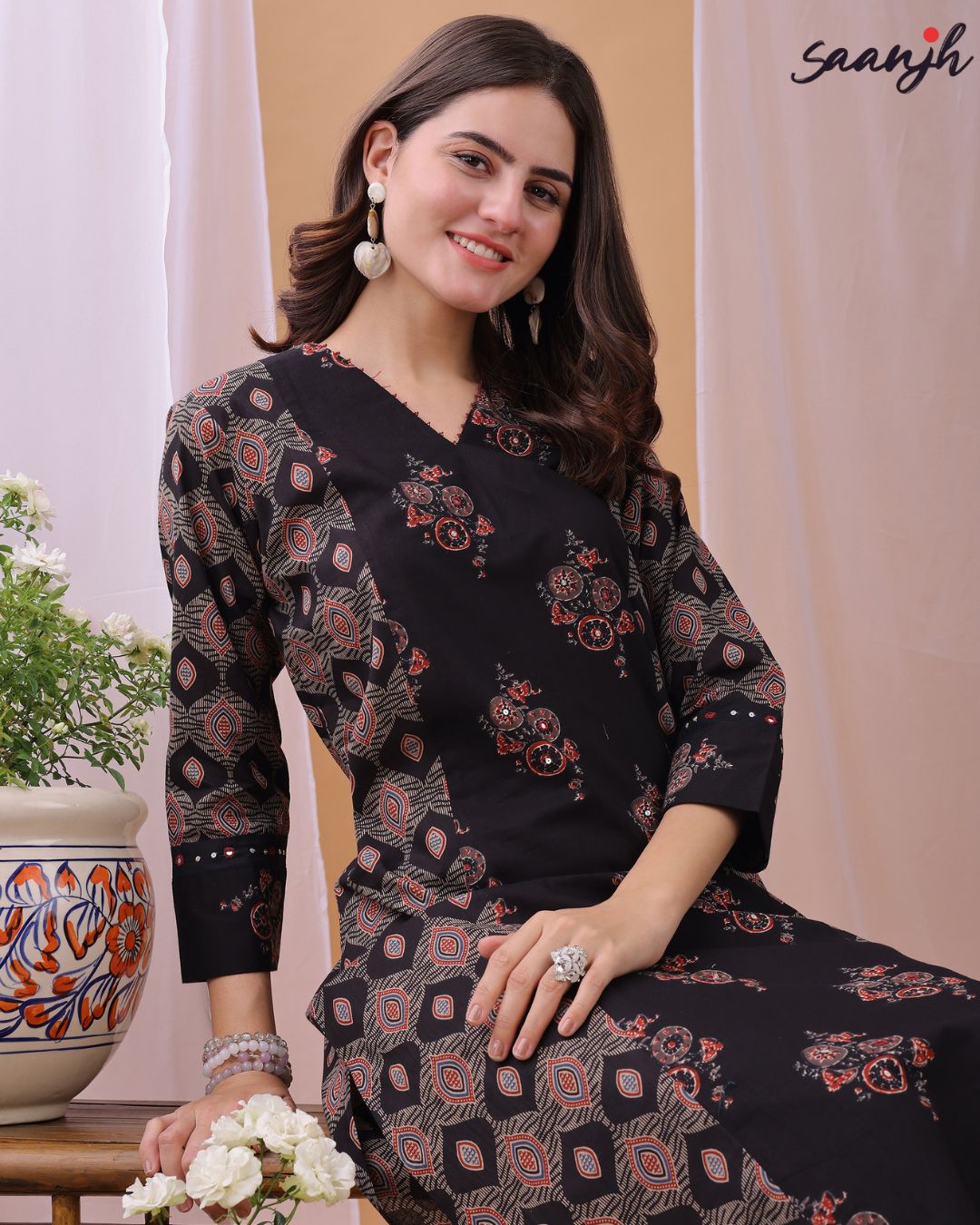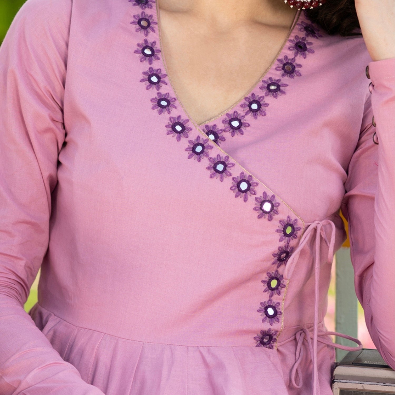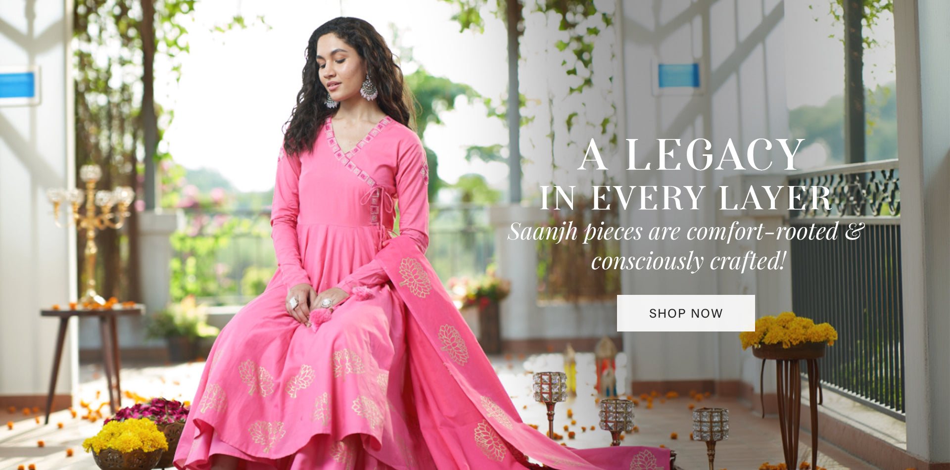 Elegant Pink kurta set crafted from pure mul cotton, featuring handwork block print on an A-line kurta with 3/4 sleeves and a V-line neckline. Comes with matching bottoms and a tassel-bordered dupatta for a graceful finish.