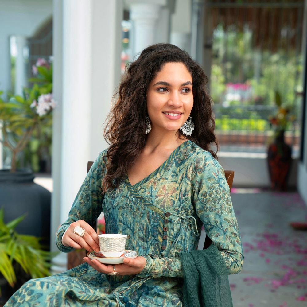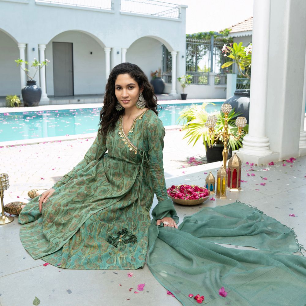 Make a graceful statement with this elegant Green kurta set, crafted from pure cotton for breathable comfort and timeless style. The A-line kurta features exquisite handwork Jardoshi embroidery, a flattering V-neckline, and full sleeves. Paired with a matching bottom, the set is completed by a coordinated Pure kota checks dupatta adorned with tassel borders, adding a touch of festive charm. Perfect for special occasions, this ensemble radiates sophistication and artisanal beauty.