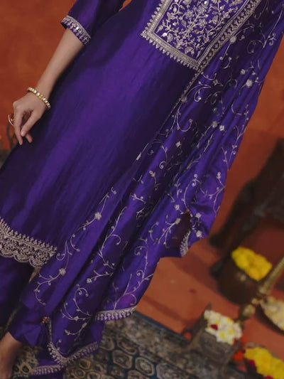 Women's Purple Silk Blend Embroidered Kurta set with dupatta