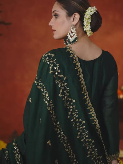 Women's Dark Green Silk Blend Sequence Embroidered Kurta and dupatta with scallop edge