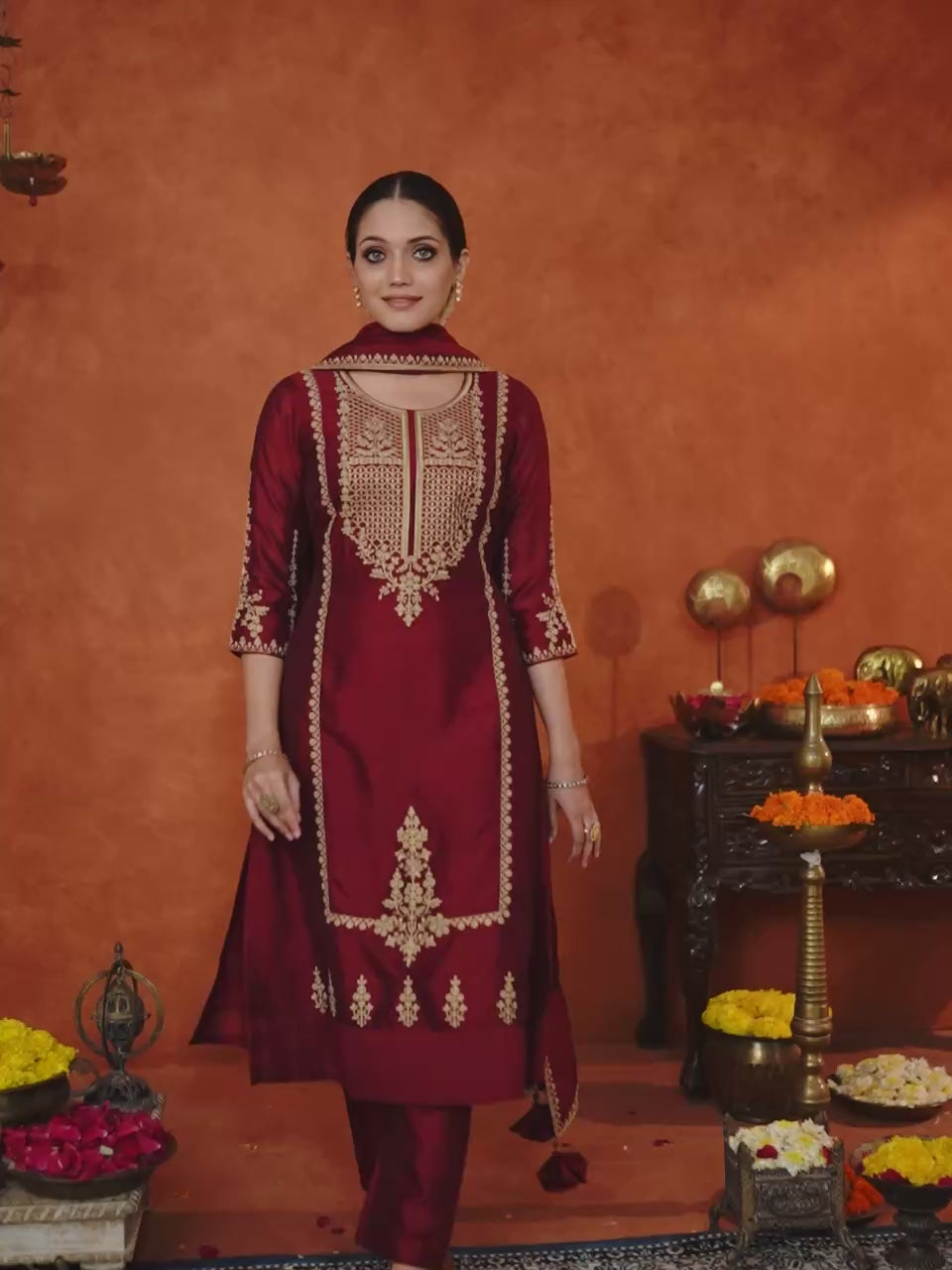Women's Maroon Silk Blend Embroidered Kurta set with dupatta