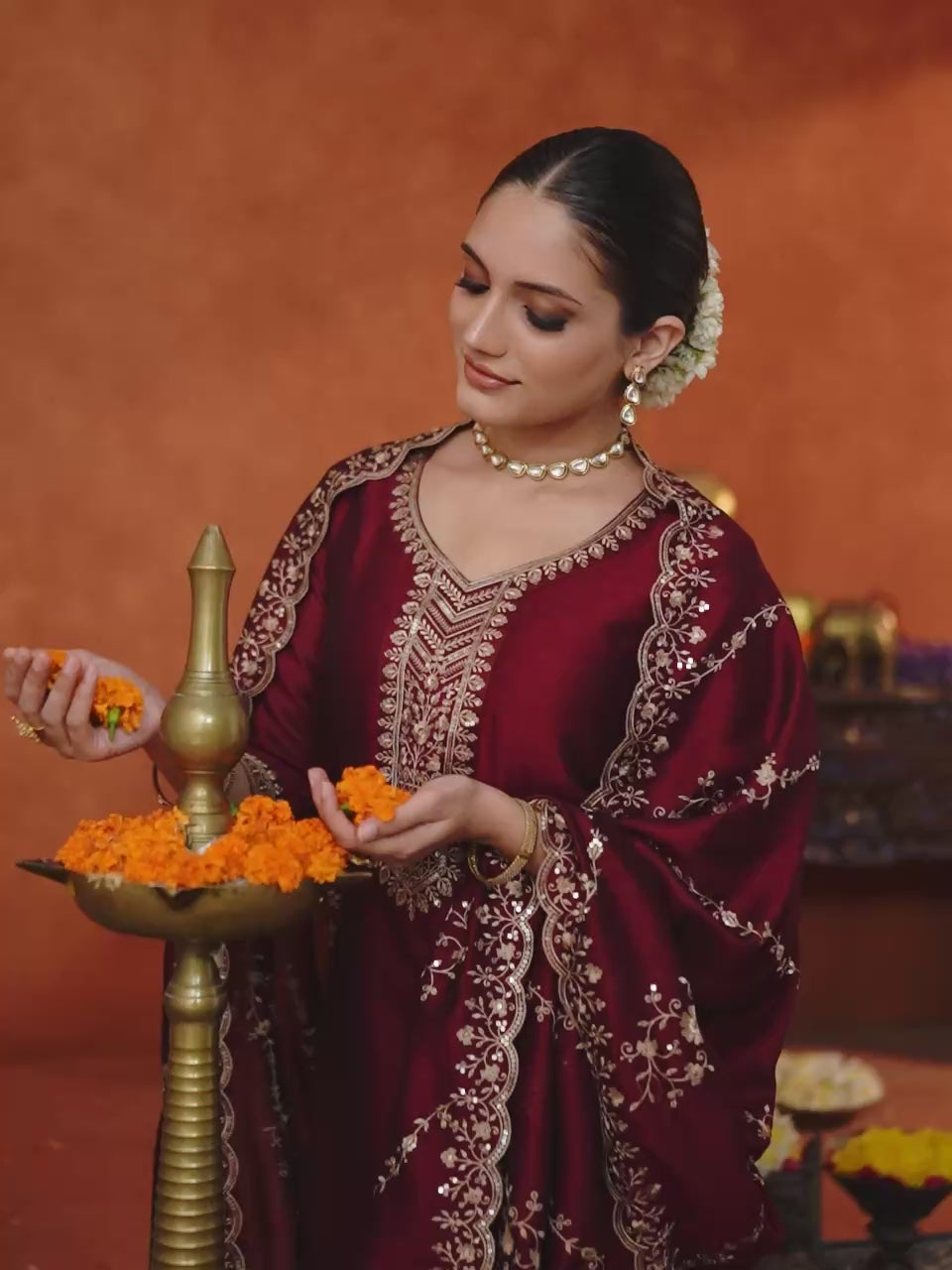 Women's Maroon Silk Blend Sequence Embroidered Kurta set with dupatta with scallop edge