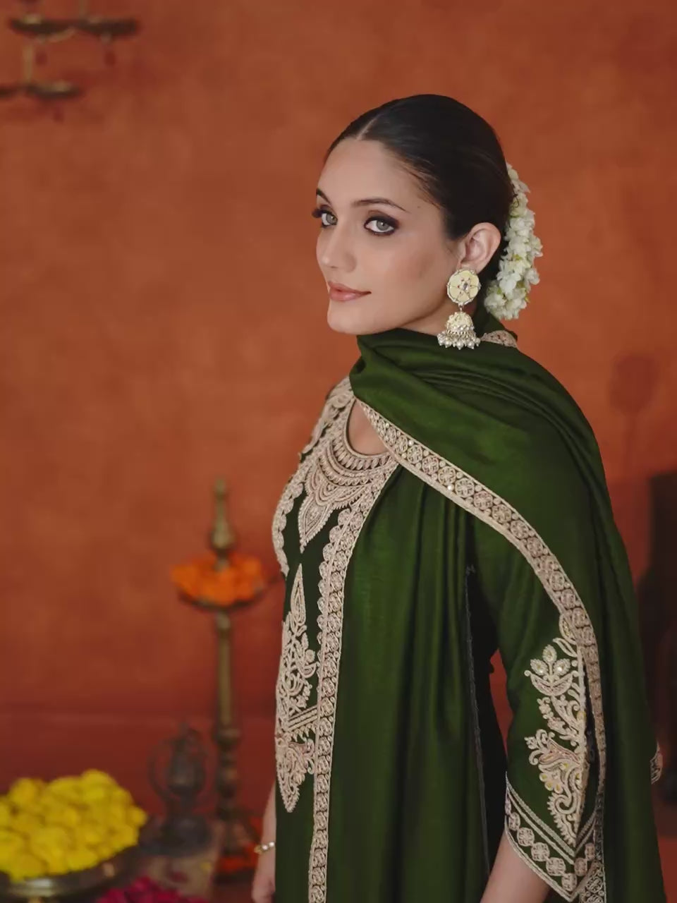 This Women's Mehndi Silk Blend Kurta Set features a straight-cut kurta with elegant embroidery, crafted from a luxurious silk blend for a refined look. The round neckline and 3/4th sleeves offer a classic silhouette, while the solid dupatta complements the ensemble with understated grace. Paired with matching pants, this set combines traditional style with modern comfort, making it ideal for festive occasions and formal gatherings.