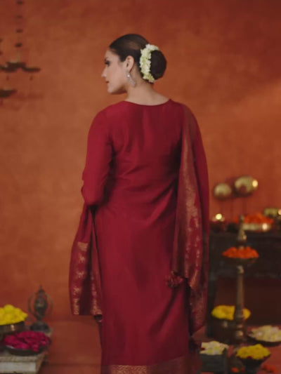 This women's kurta set features a pure muslin fabric in a rich red shade, offering breathable comfort and a refined look. The pleated kurta is designed with a classic round neckline and 3/4th sleeves, paired with matching pants for a coordinated ensemble. The woven jacquard dupatta adds texture and elegance, making this set suitable for both casual and semi-formal occasions.