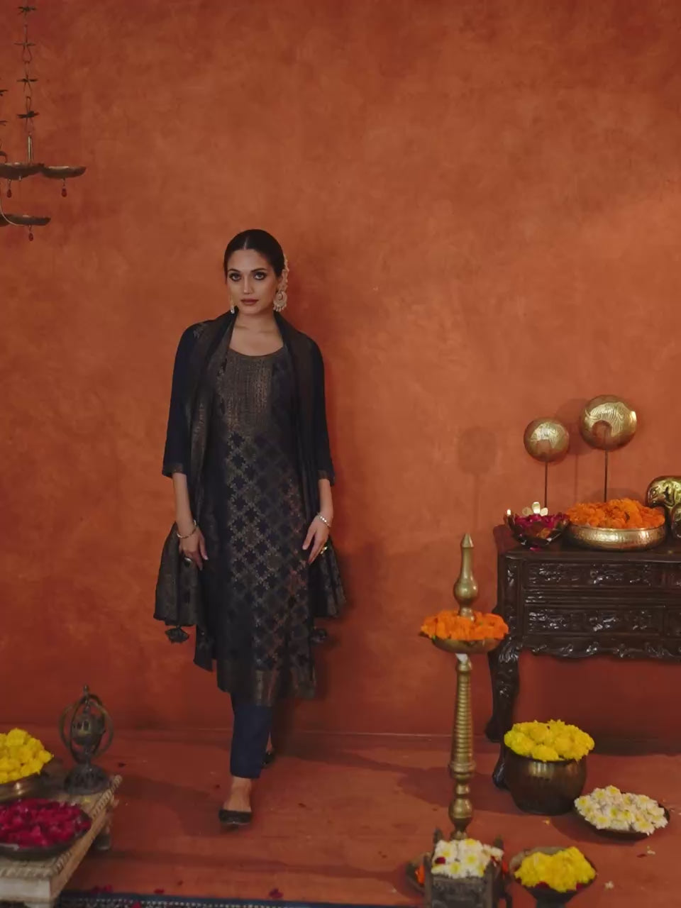 Women's Navy Pure Muslin Woven Jacquard Kurta set with dupatta